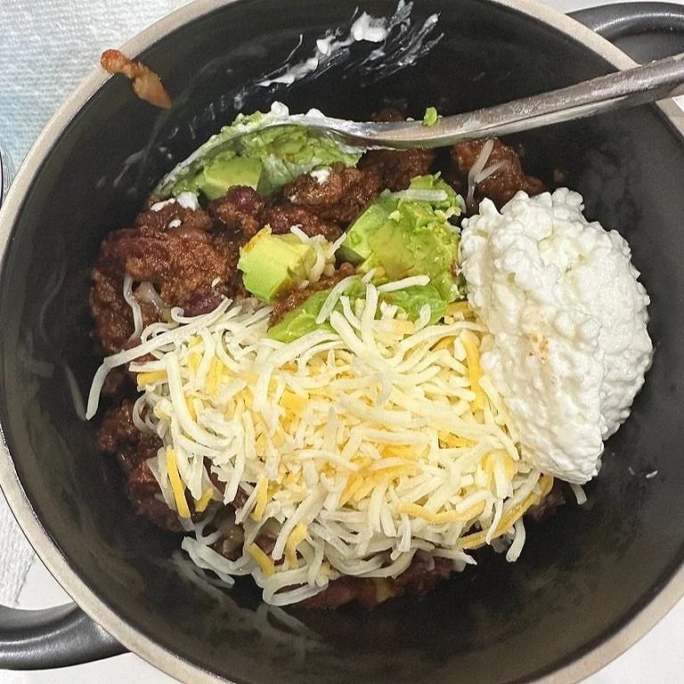 Serve this famous chili in bowls and let your guests customize their experience with an array of garnishes – shredded cheese, avocado, sour cream (cottage cheese or plain Greek yogurt for my healthy peeps), chopped green onions, jalapeño or a sprinkle of fresh cilantro. Some Fritos or tortilla chips don’t hurt either! Each topping adds its own note to the culinary symphony.